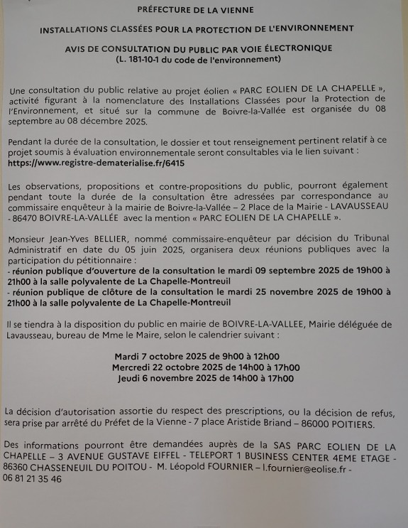 La consultation du public porte sur le projet éolien « PARC EOLIEN DE LA CHAPELLE », activité figurant à la nomenclature des Installations Classées pour la Protection de l’Environnement, et situé sur la commune de Boivre-la-Vallée à proximité de la limite avec notre commune.